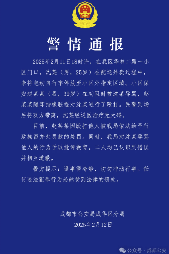 2月12日晚,四川成都市公安局成华区分局通报,2月11日18时许,在该区华林二路一小区门口,沈某(男,25岁)在配送外卖过程中,未将电动自行车停放至小区外指定区域。小区保安赵某某(男,39岁)在劝阻时被沈某辱骂杠杆炒股多少钱,赵某某随即持橡胶棍对沈某进行了殴打。民警到场后将双方带离,沈某经送医治疗无大碍。